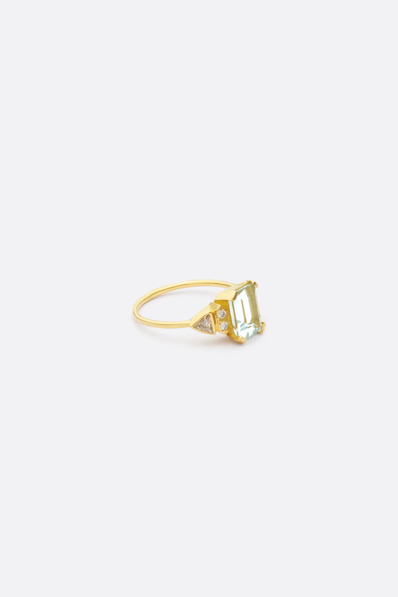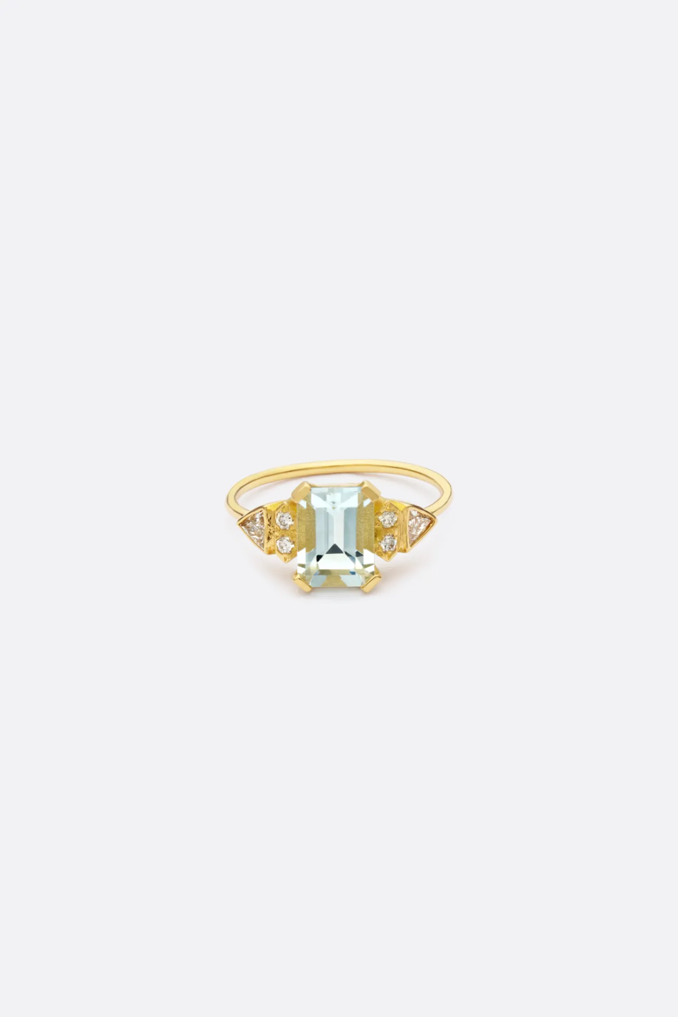 La bague Arès avec un esprit Art Déco est en or 18 carats. Sa pierre centrale, une topaze bleue taille émeraude est entourée de diamants. Arès se décline en or jaune, or rose ou or blanc et est idéale pour une bague de fiançailles.