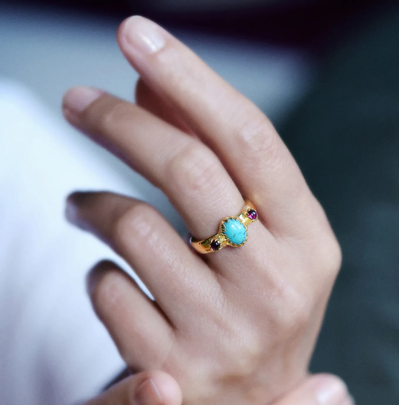 La bague Athénaïs s’inspire des bijoux d’autrefois et surprend avec ses pierres (turquoise, grenat ou mélange des deux). Cette pièce peut se graver. La bague Athenais se décline en argent ou en vermeil.