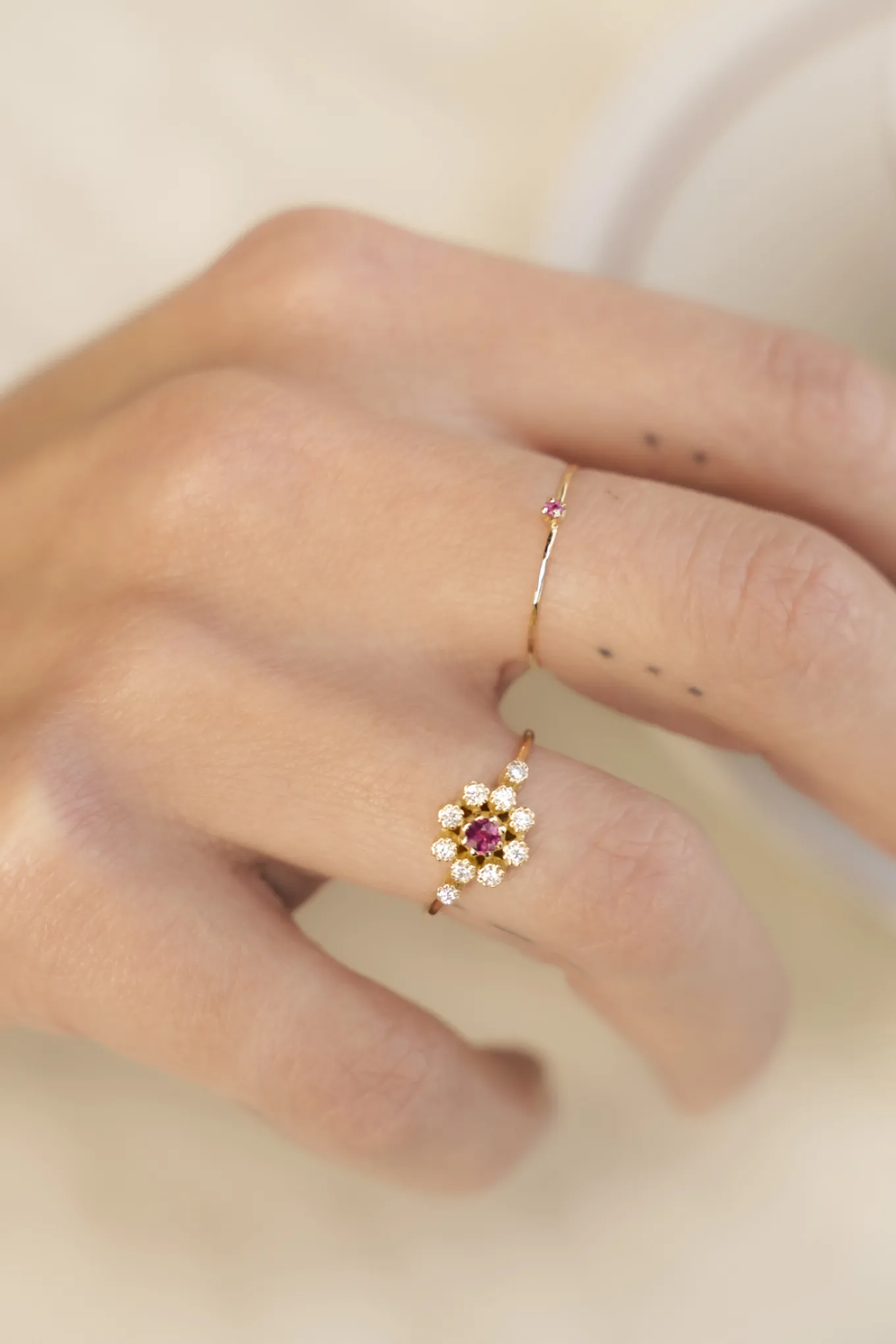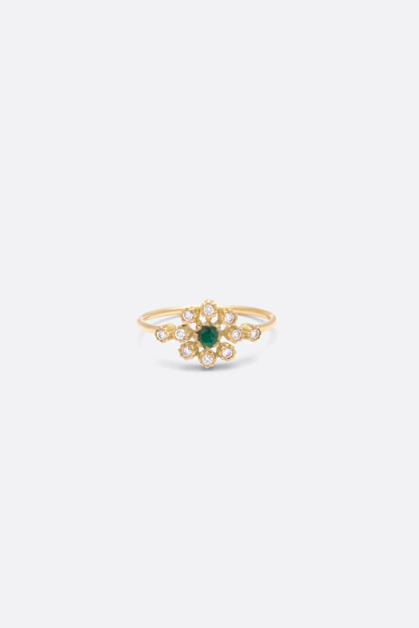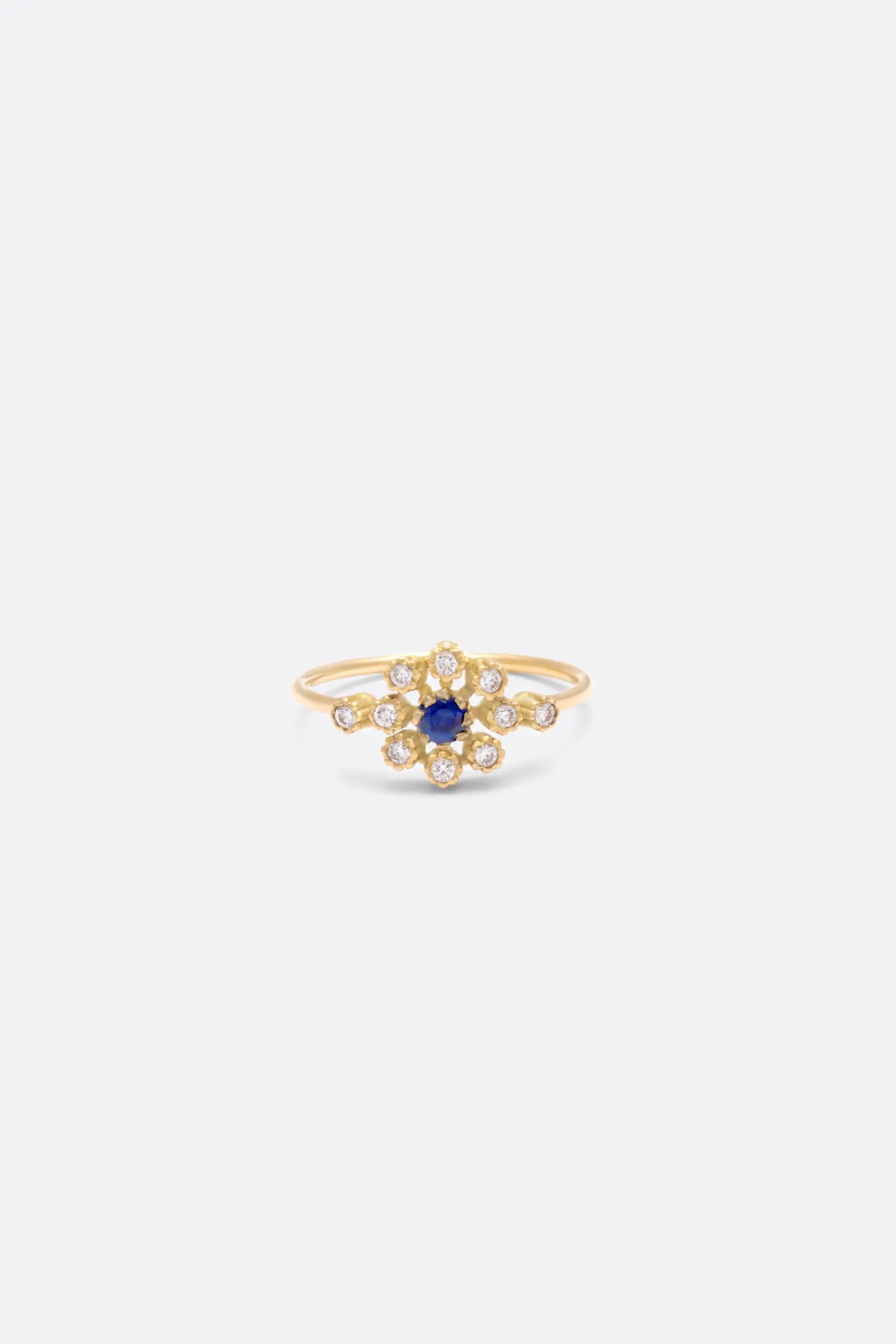 Dix pétales de diamants taille brillant entourant un pistil de la pierre précieuse de votre choix: diamant, rubis, émeraude ou saphir. Parfaite pour une bague de fiançailles, elle accompagnera avec délicatesse le quotidien, qu’elle soit façonnée en or jaune, or rose ou or blanc.