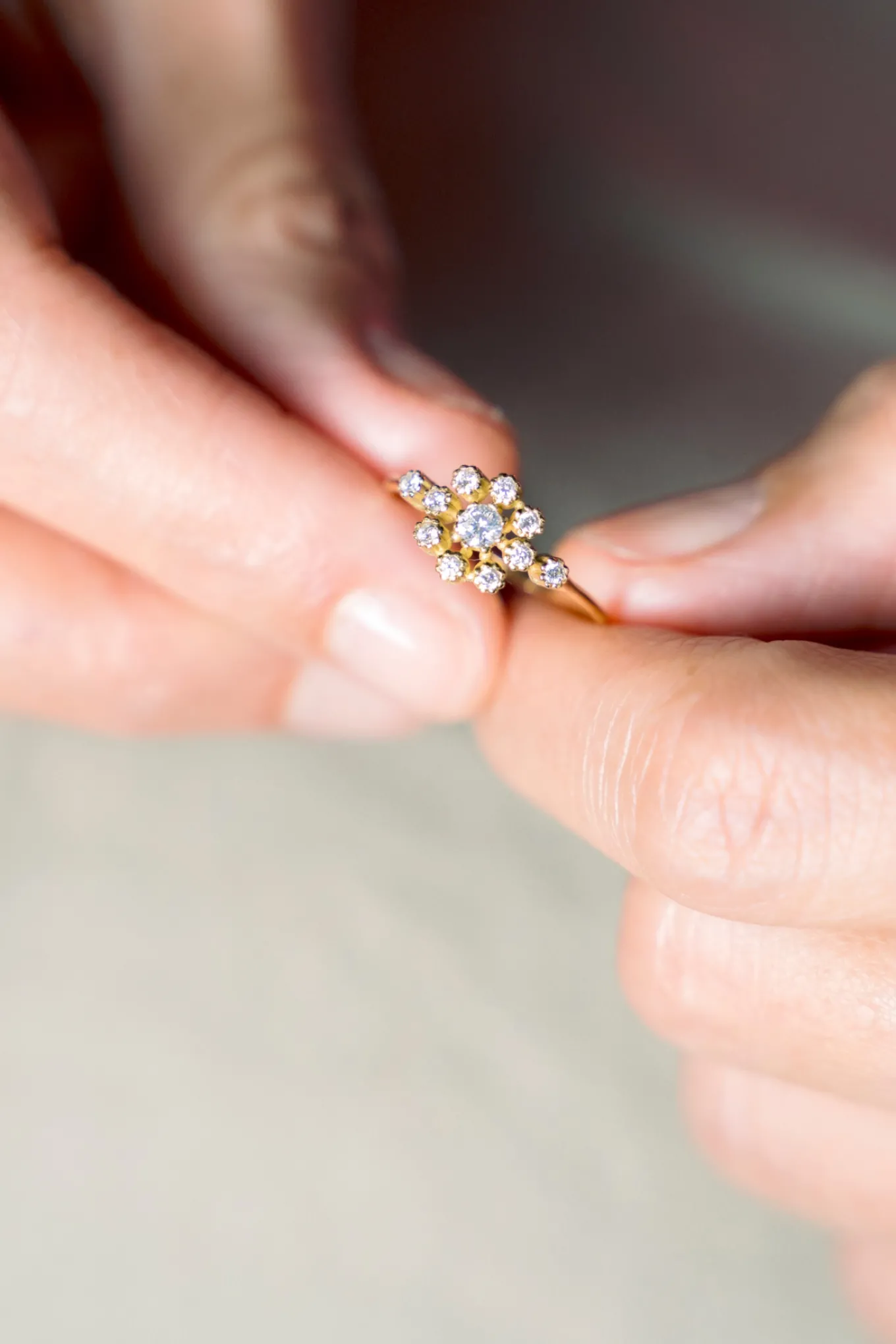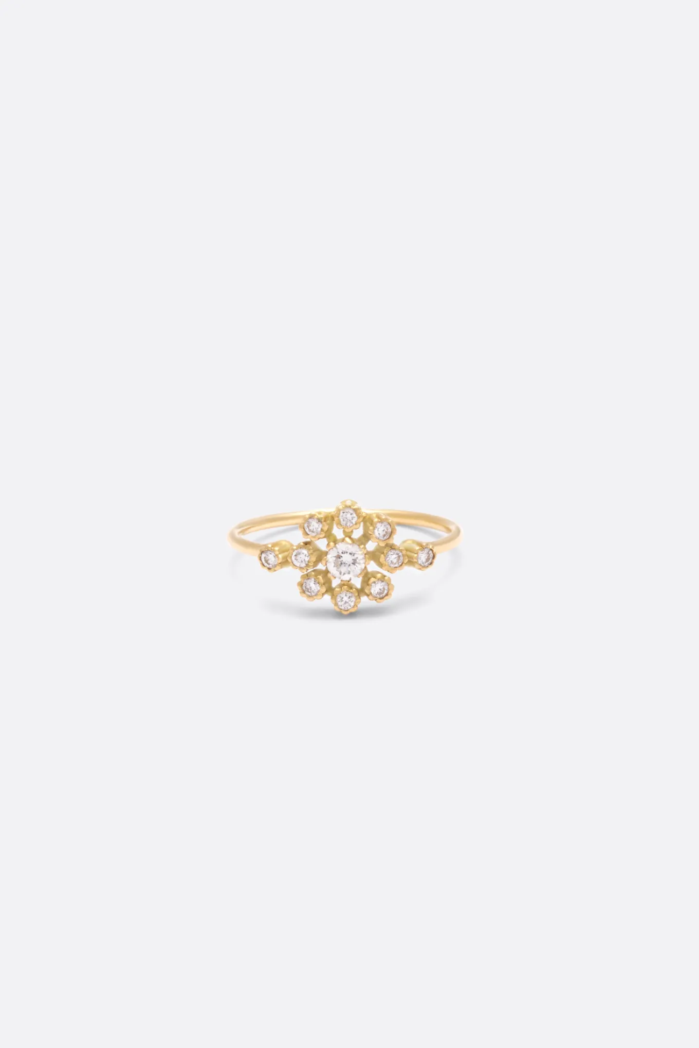 Dix pétales de diamants taille brillant entourant un pistil de diamant. Parfaite pour une bague de fiançailles, elle accompagnera avec délicatesse le quotidien, qu’elle soit façonnée en or jaune, or rose ou or blanc.