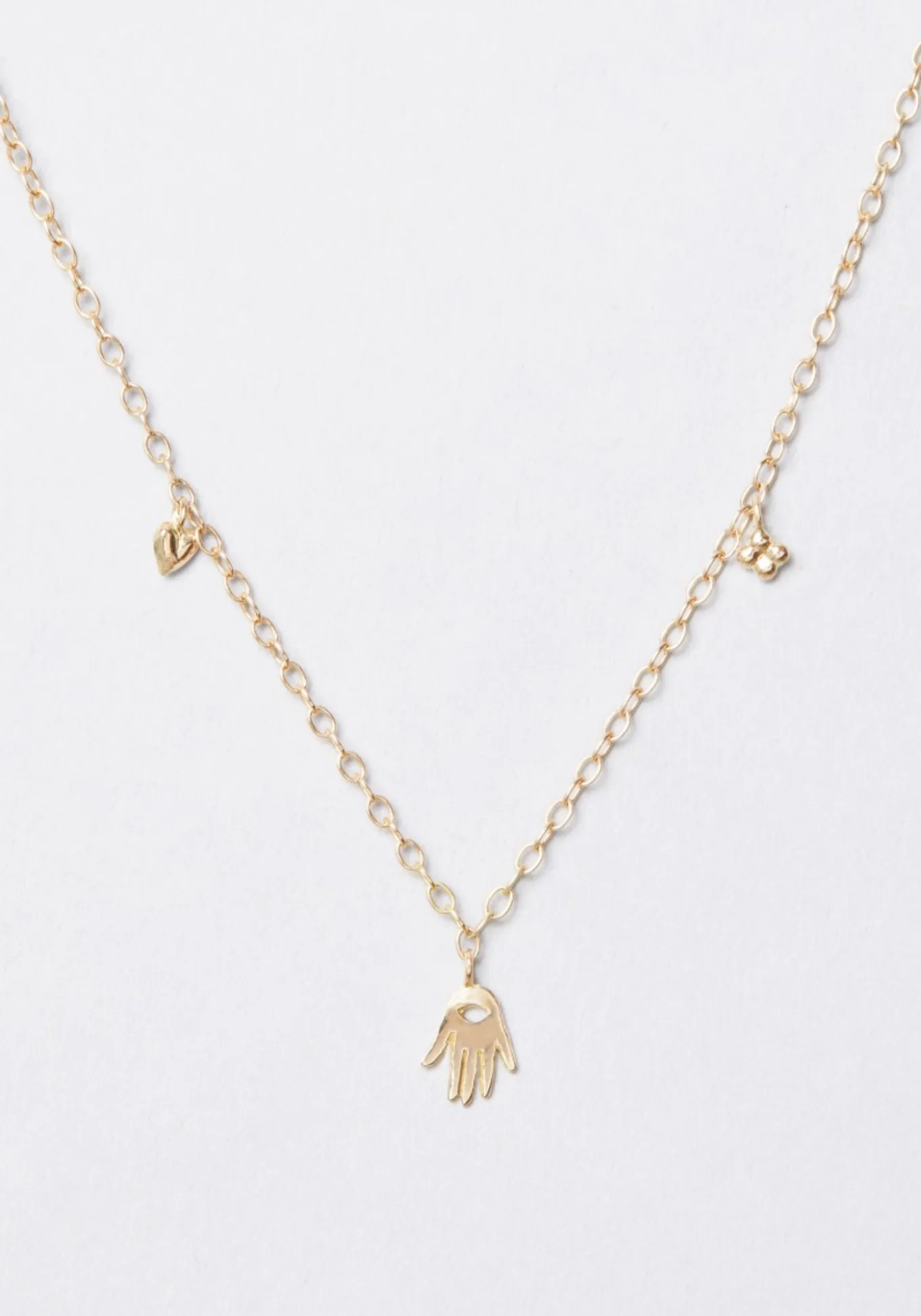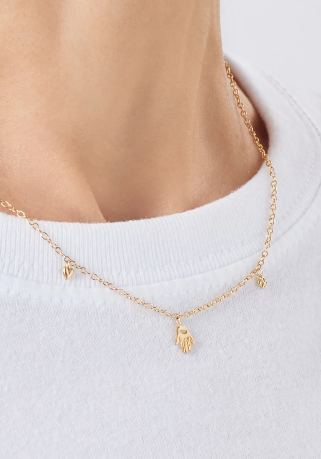 Le collier Dina en or 18 carats est composé de 3 pendants porte-bonheur : une main, un coeur et un trèfle. Le collier Dina peut être façonné uniquement en or jaune.