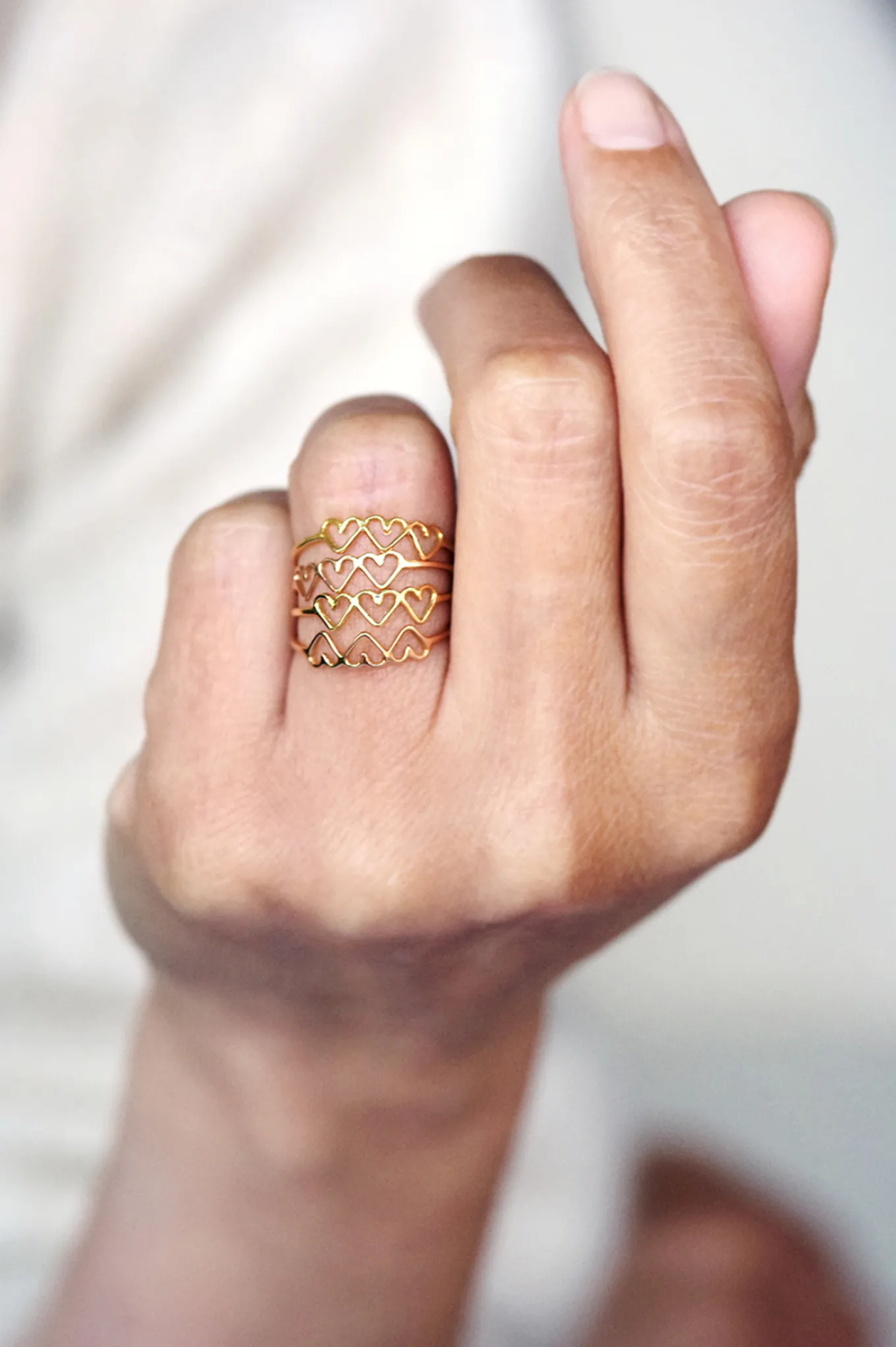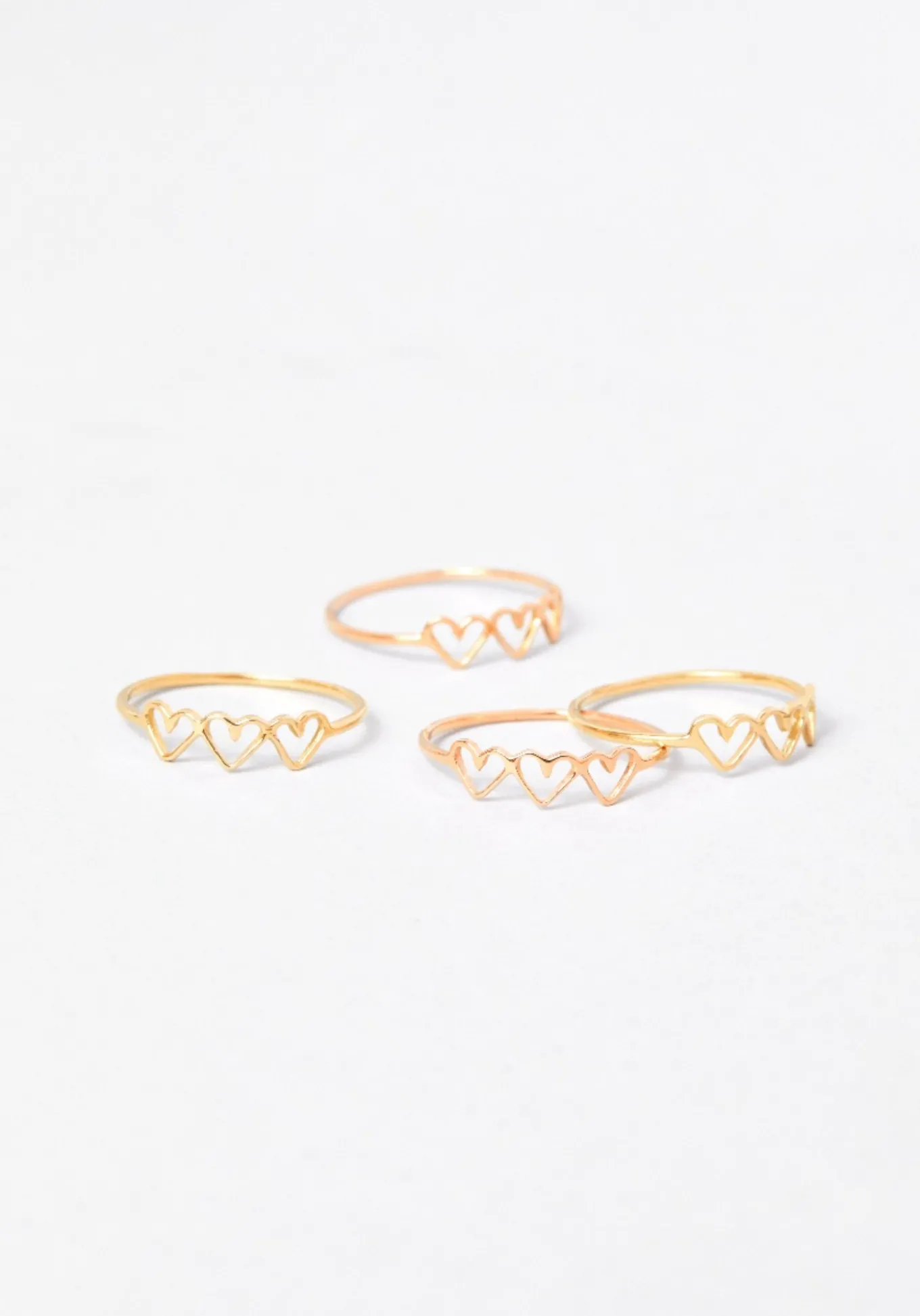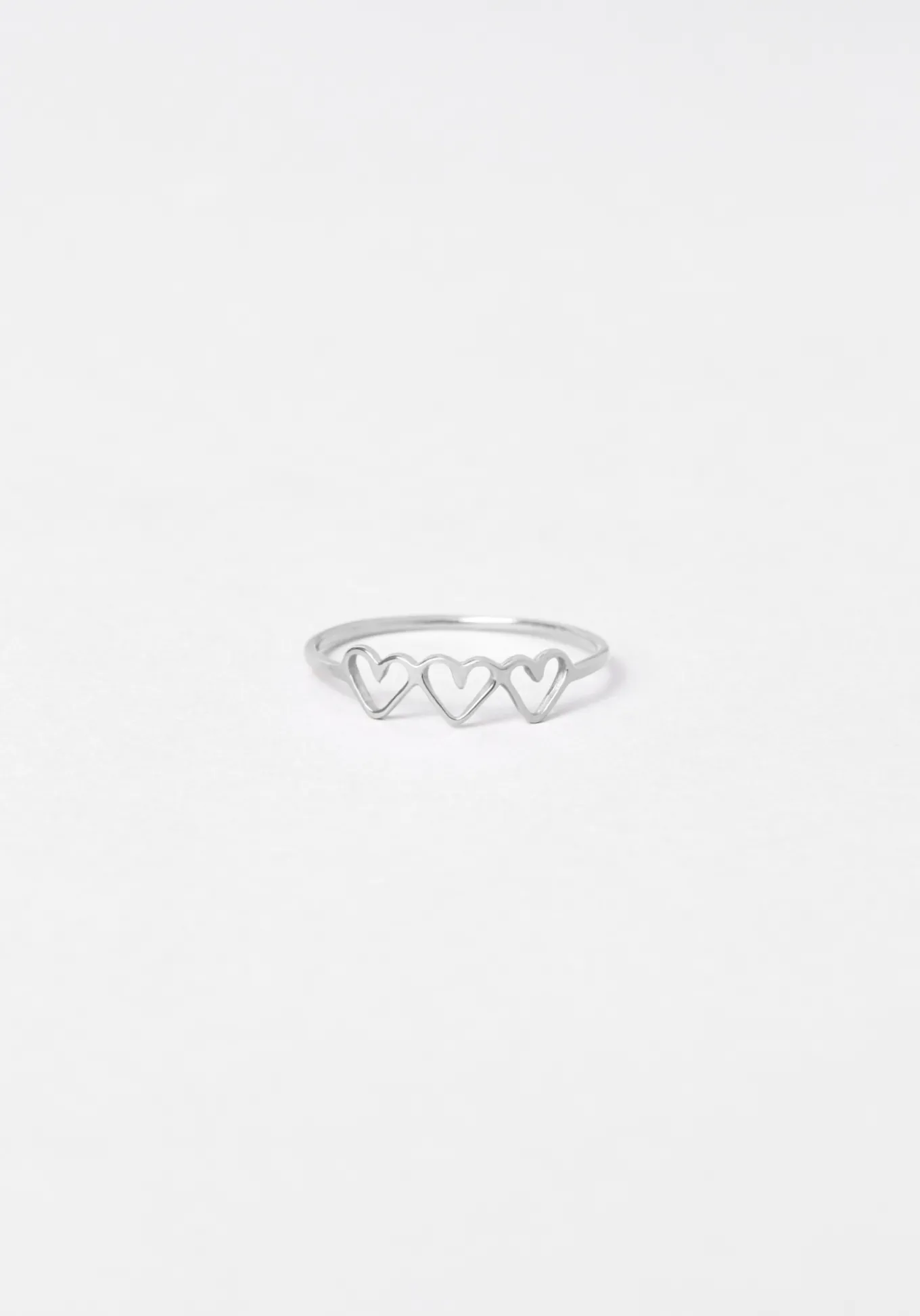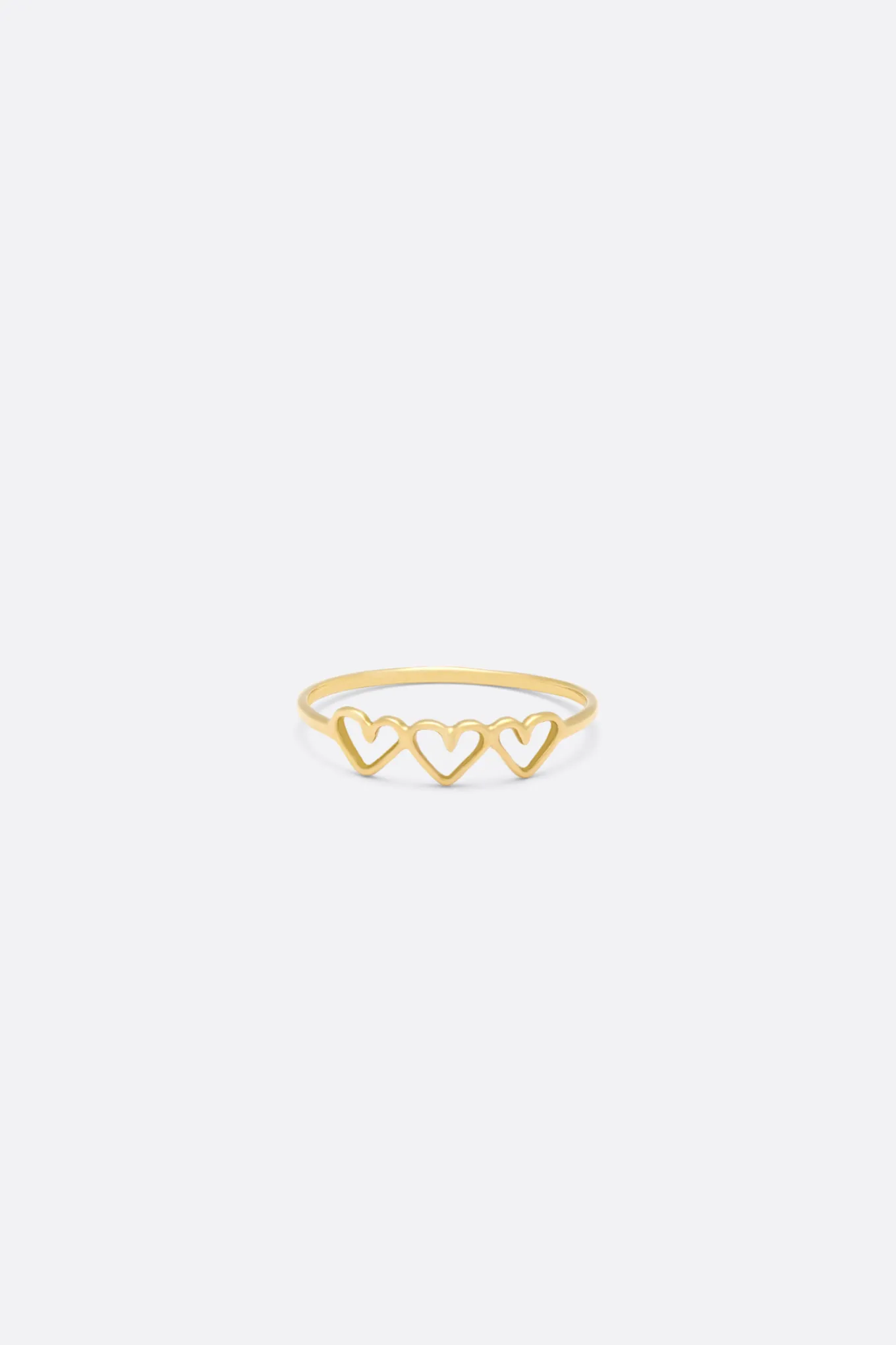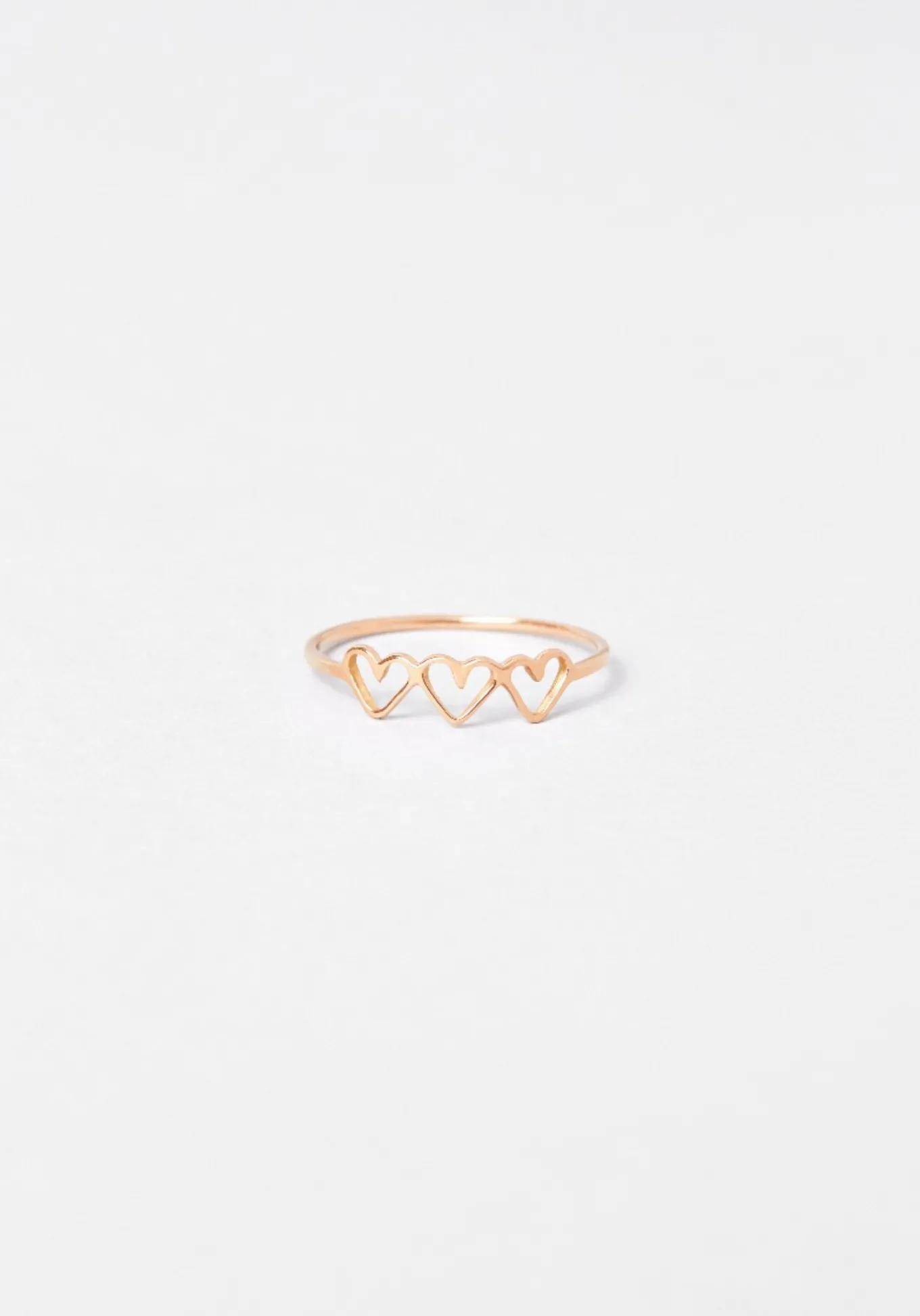 Discrète et charmante, la bague Hayda présente un triptyque de trois petits coeurs en or 18 carats. Hayda se décline en or jaune, or rose ou or blanc.