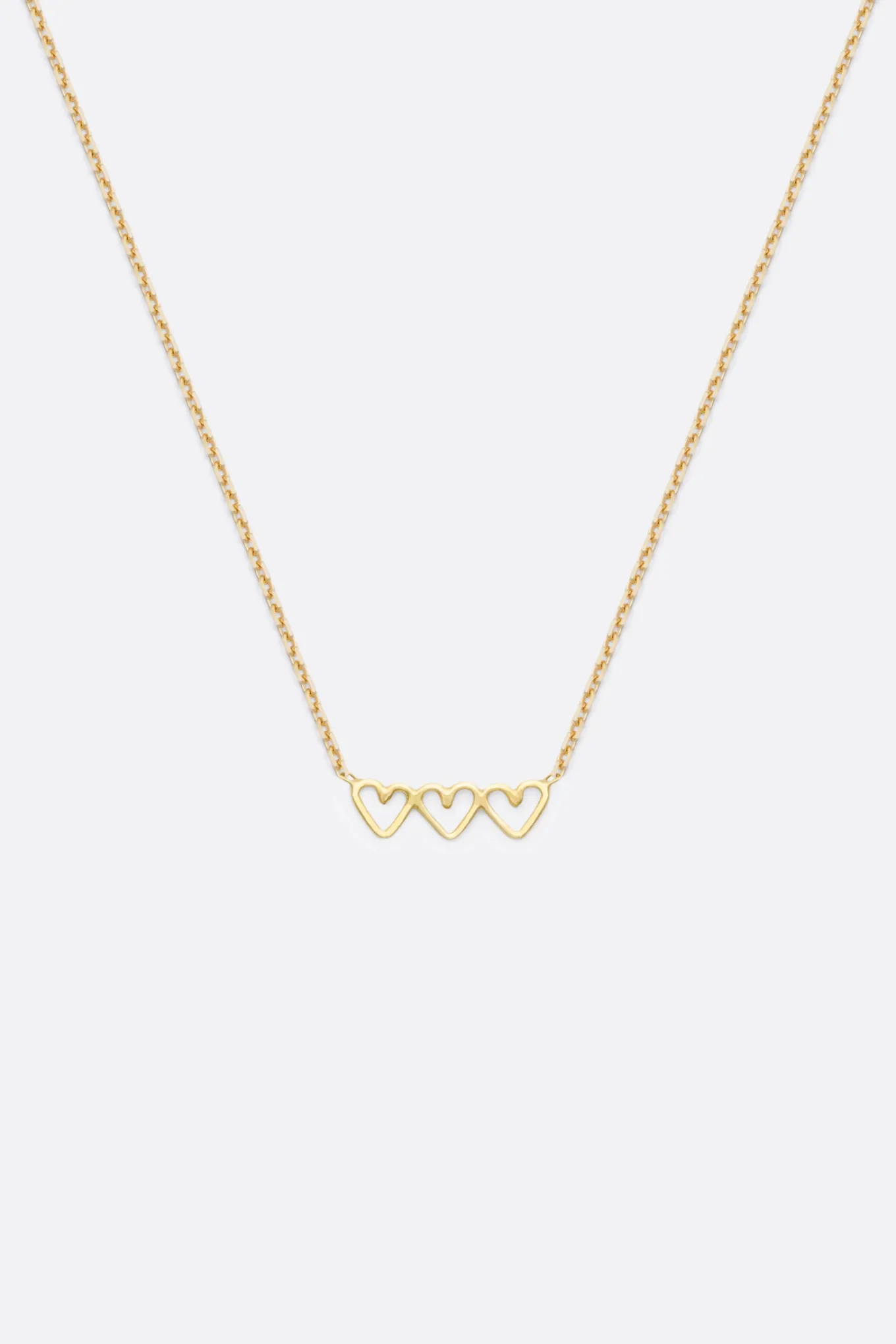 Discret et charmant, le collier Hayda présente un triptyque de trois petits coeurs en or 18 carats. Hayda se décline en or jaune, or rose ou or blanc.