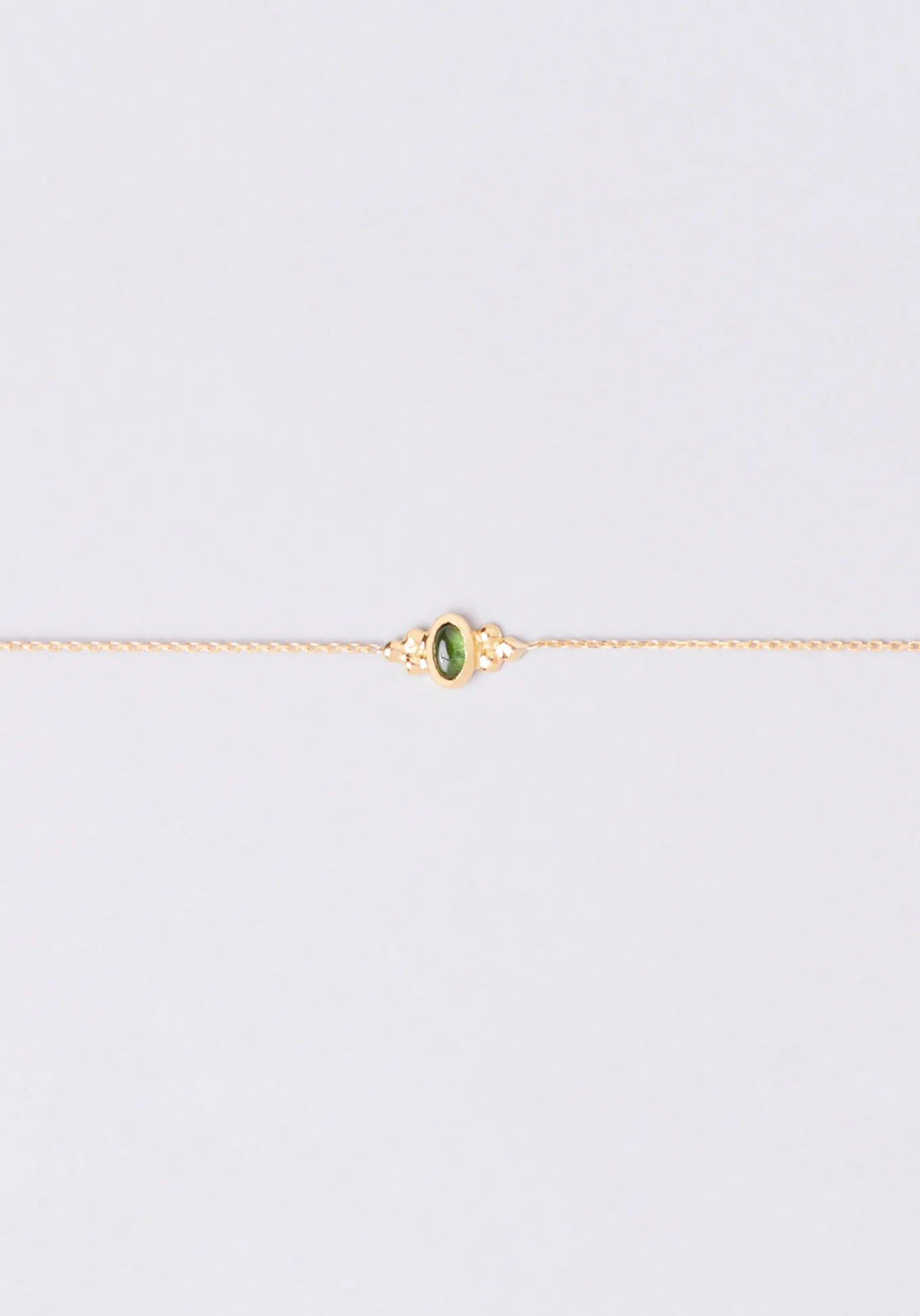 Comme un bijou hérité, le bracelet Lila en or 18 carats a tout de la pièce chargée d’histoire. La pierre de centre, une tourmaline verte, est mise en valeur par son serti doré. Le bracelet Lila se décline en or jaune, or rose ou or blanc.