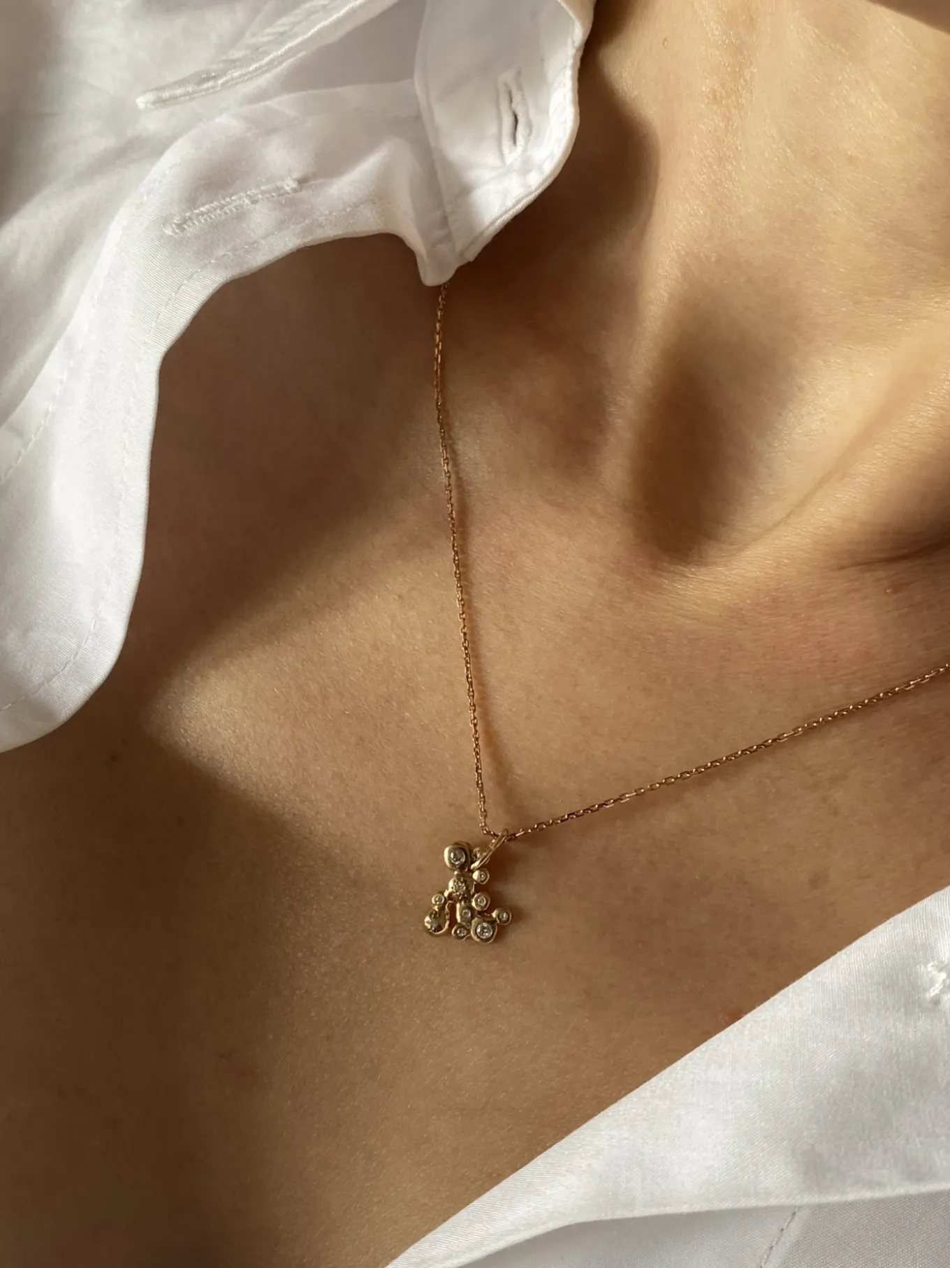 Collier en or 18 carats, la chaine et le pendentif du collier Louison ne sont que finesse et délicatesse. Chaque pastille d’or posée les unes à côté des autres du pendentif sont serties à la main d’un diamant blanc. Comme une constellation d’or parsemée d’étoiles, le collier Louison se décline en or jaune, or rose ou or blanc.