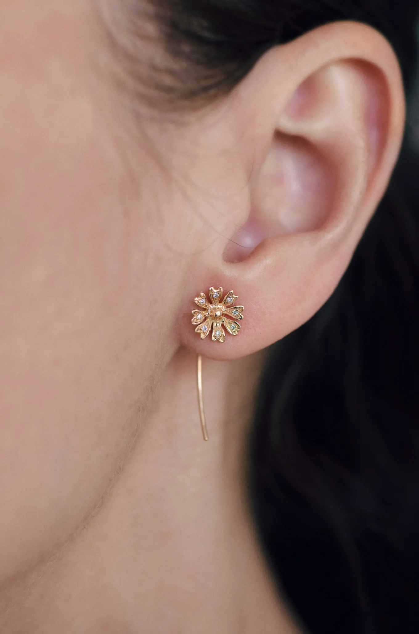 La boucle Louiza éclot dans une superbe fleur sertie de diamants blancs ou noirs sur chaque pétale, au bout d’une fine tige d’or. Boucle en or 18 carats, Louiza se décline en or jaune, or rose ou or blanc.