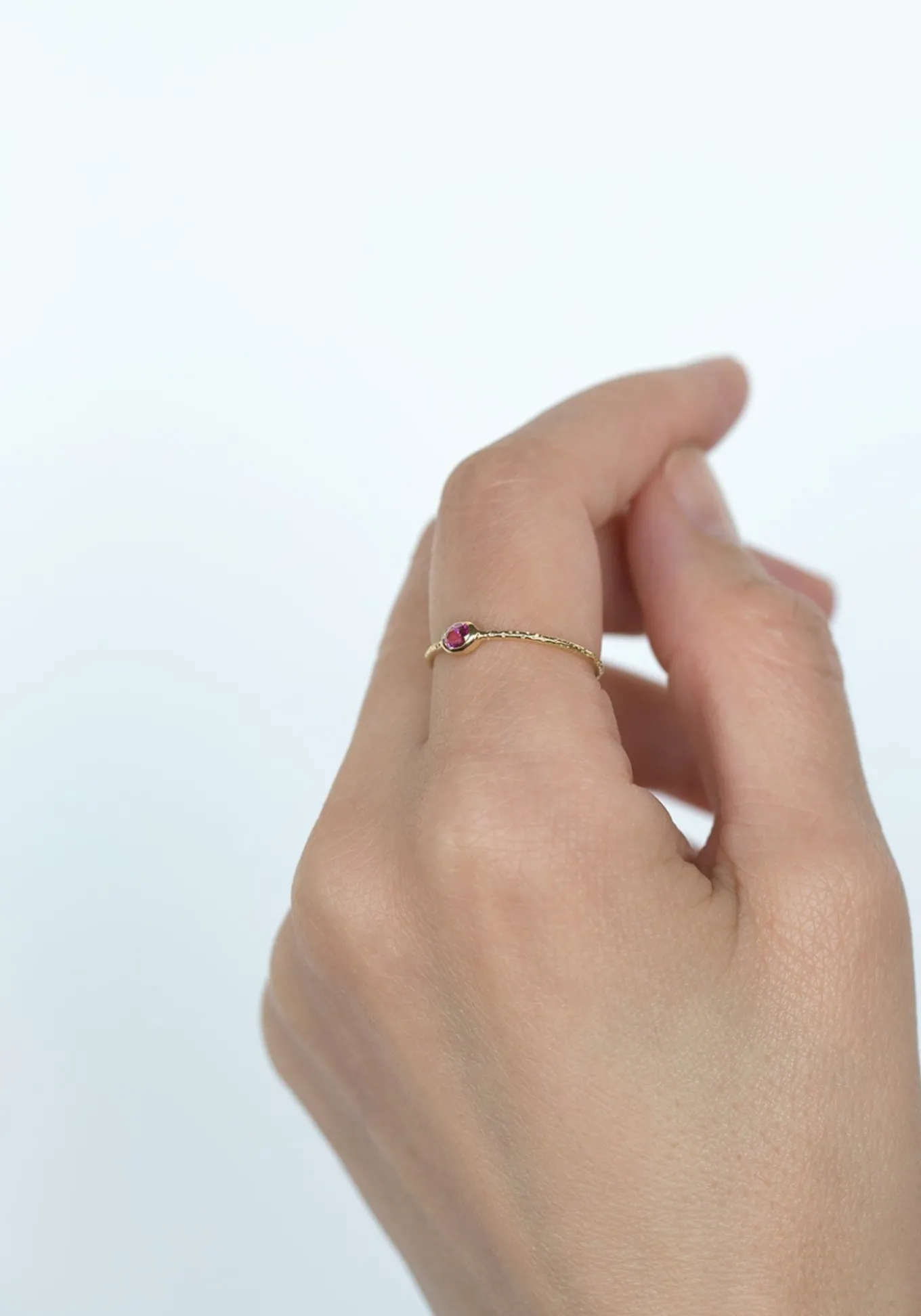La bague Marion brille d’un éclat sans pareil non seulement grâce à son quartz ou grenat de centre, mais aussi grâce à son fil d’or piqueté à la main. La bague Marion se décline en or jaune, or rose ou or blanc.