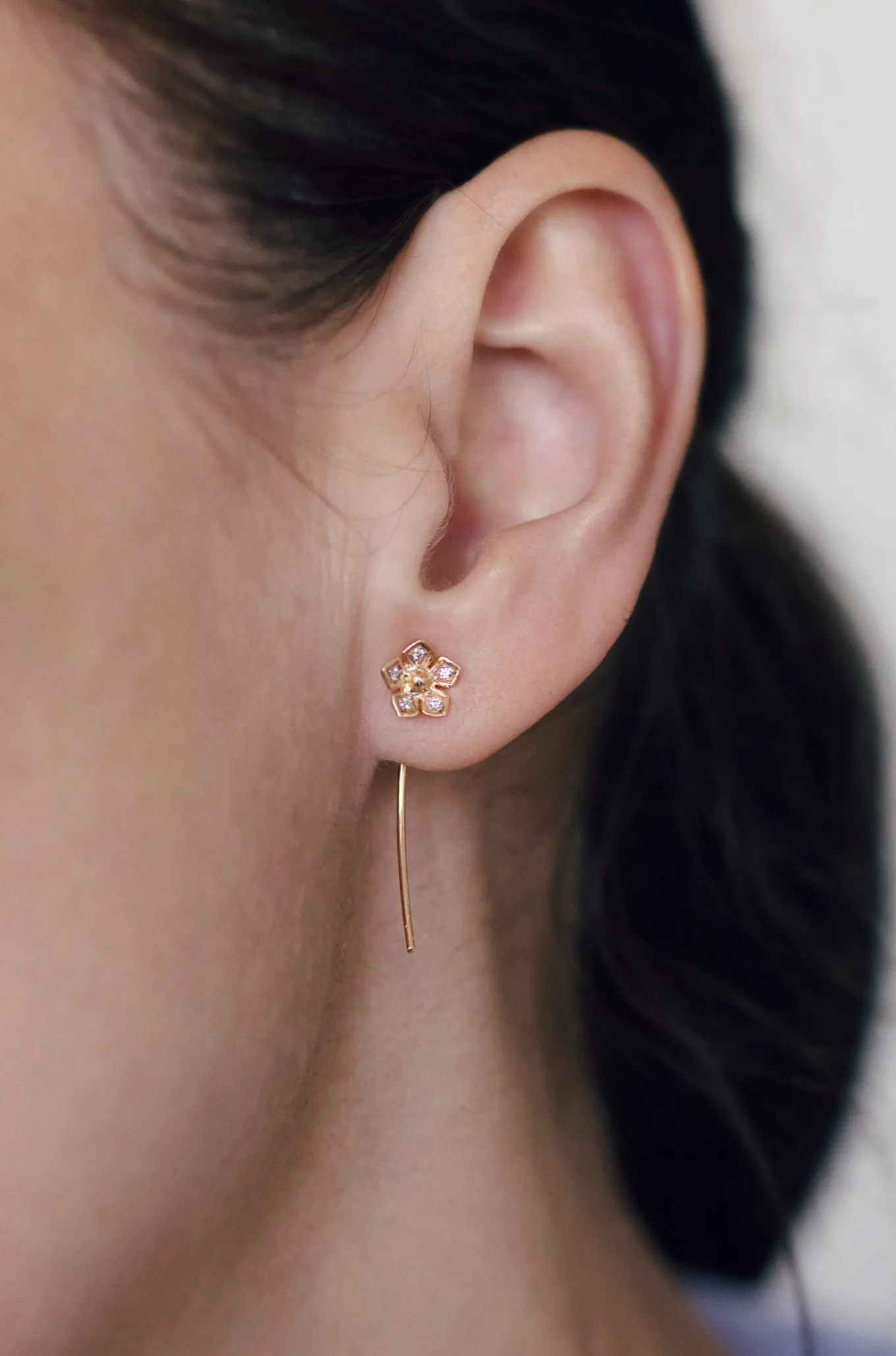 La boucle Nina éclot dans une superbe fleur sertie de diamants blancs ou noirs sur chaque pétale, au bout d’une fine tige d’or. Boucle en or 18 carats, Nina se décline en or jaune, or rose ou or blanc.
