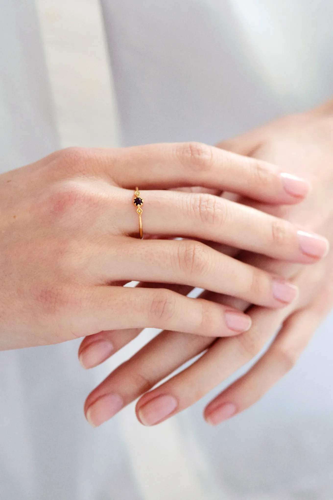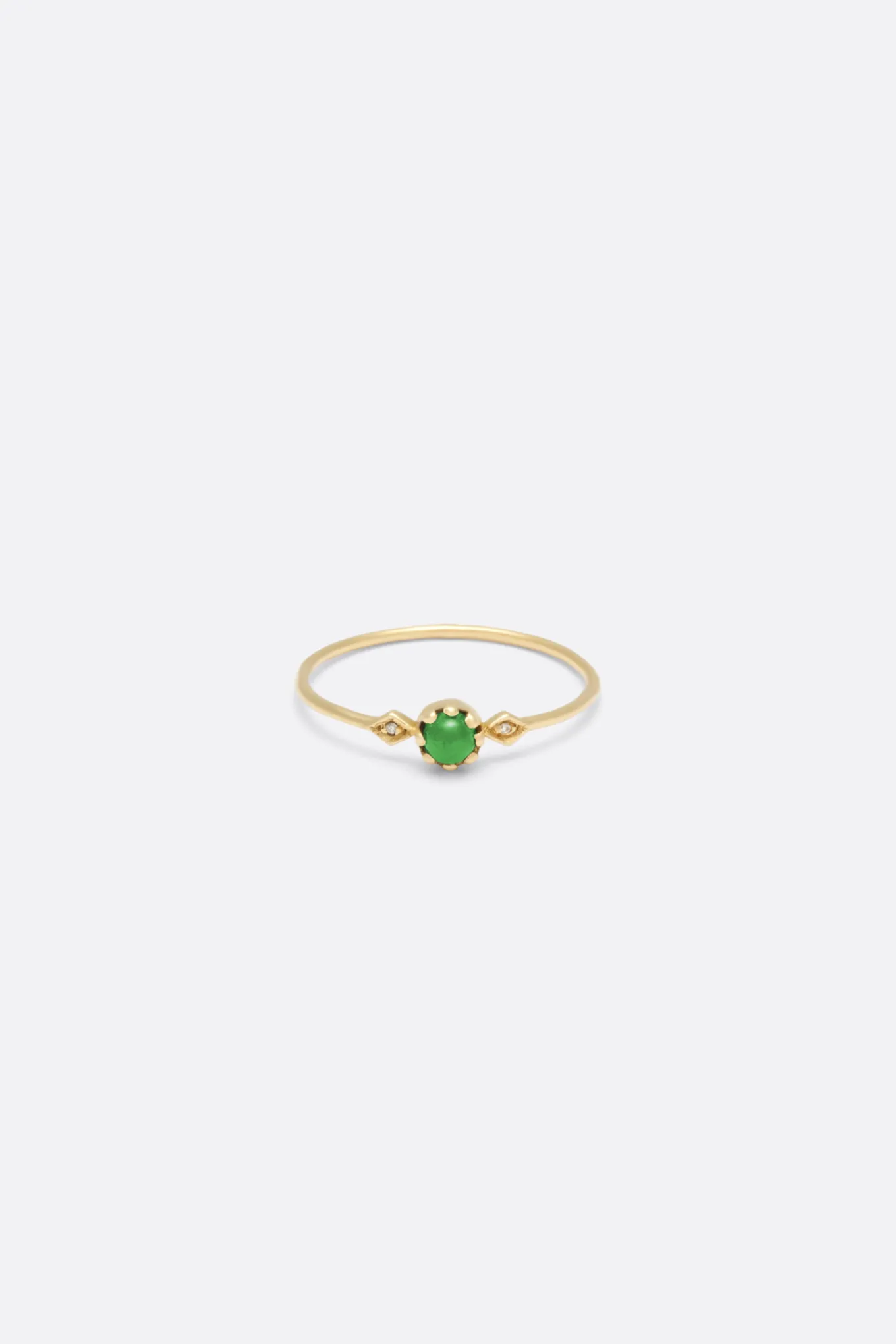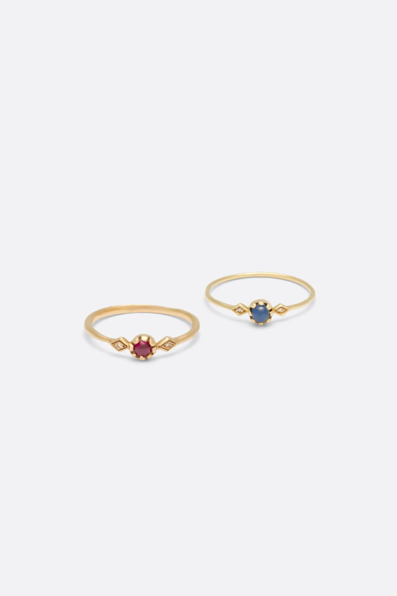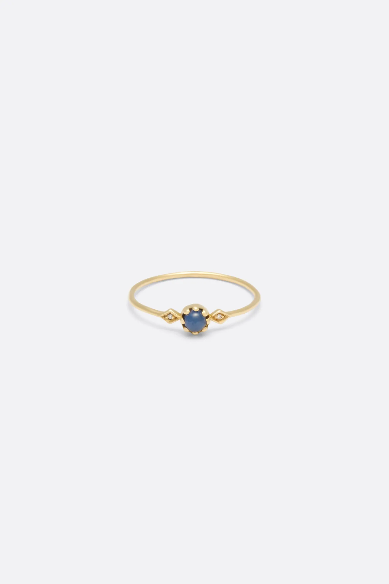La bague Pénélope II mise sur une pierre de centre délicatement sertie et épaulée de deux losanges dorés sertis de diamants blancs. La bague Pénélope II en or 18 carats se décline en or jaune, or rose ou or blanc.