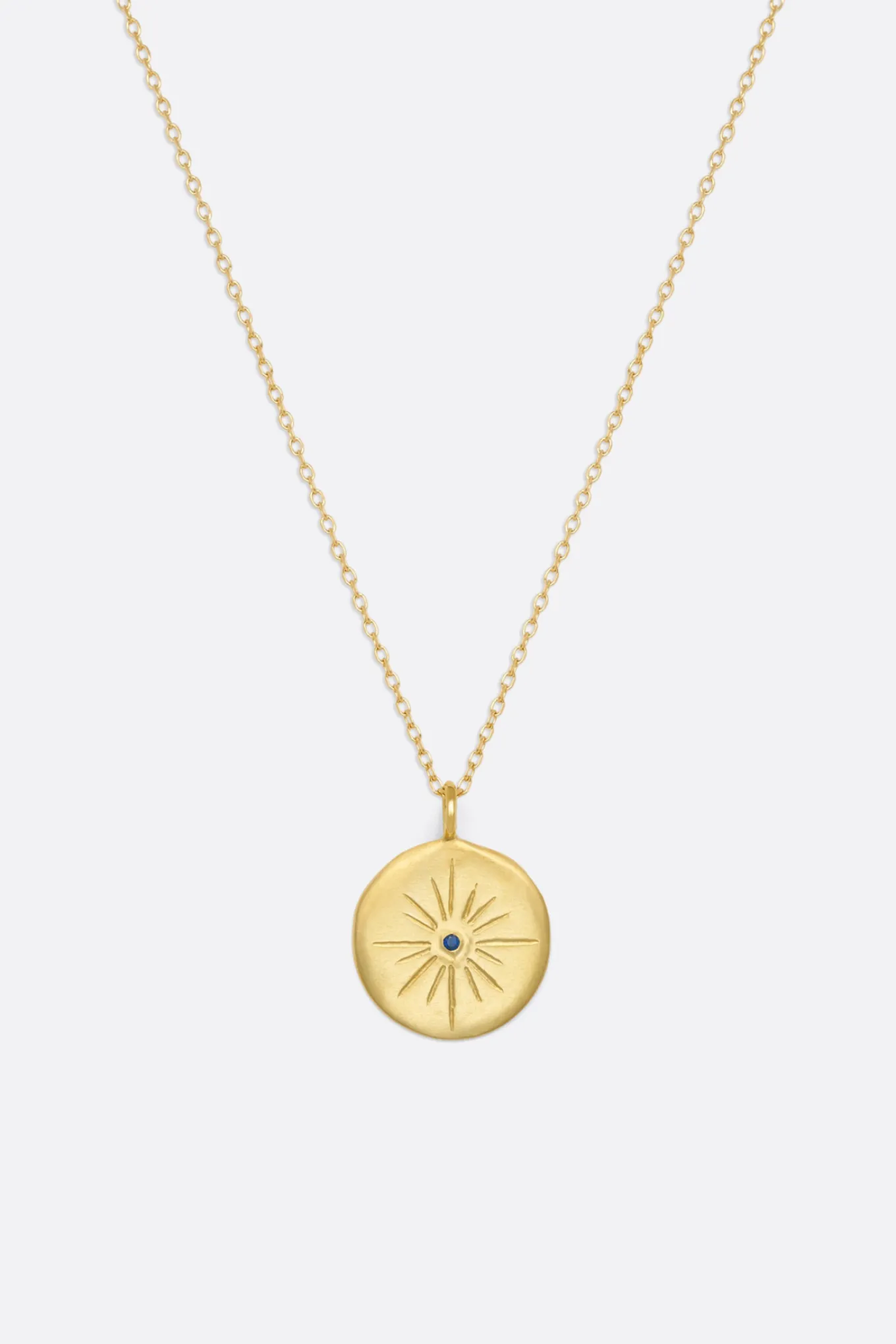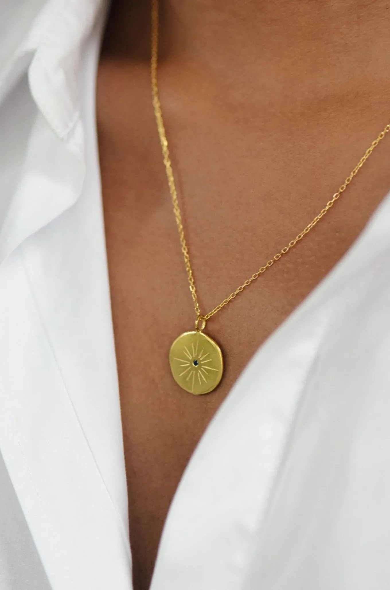 Médaille d’inspiration berbère, le collier Rima, composé d’une chaîne fine et délicate, se décline en argent ou en vermeil. Gravé et serti à la main par nos bijoutières, le point symbolisé ici par un saphir représente le centre, le foyer, la maison. Le collier Rima deviendra très vite un véritable talisman. La gravure sur médaille est disponible.