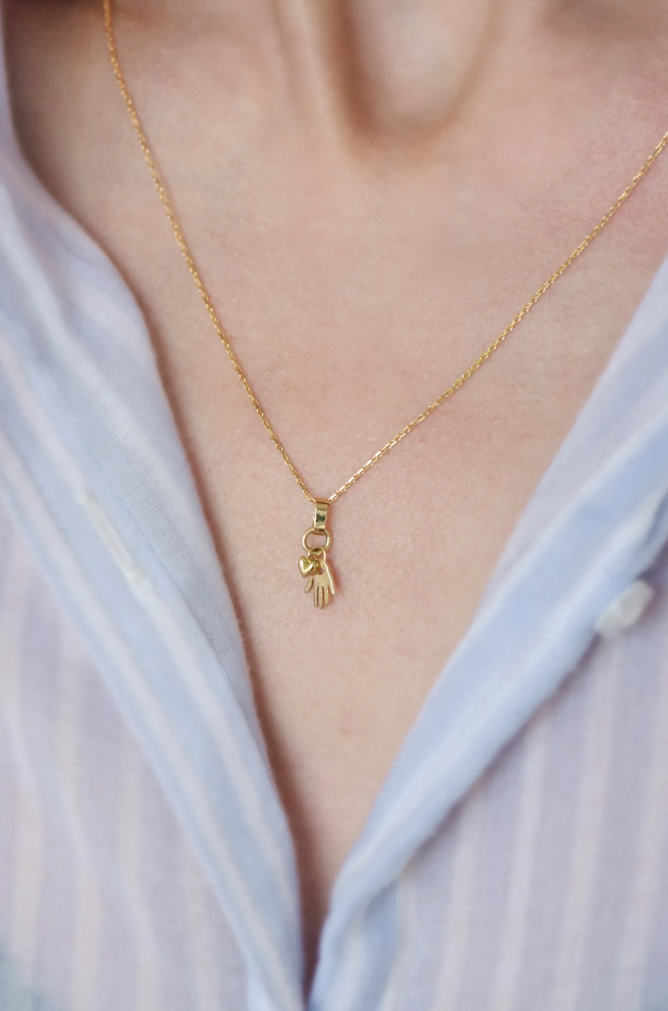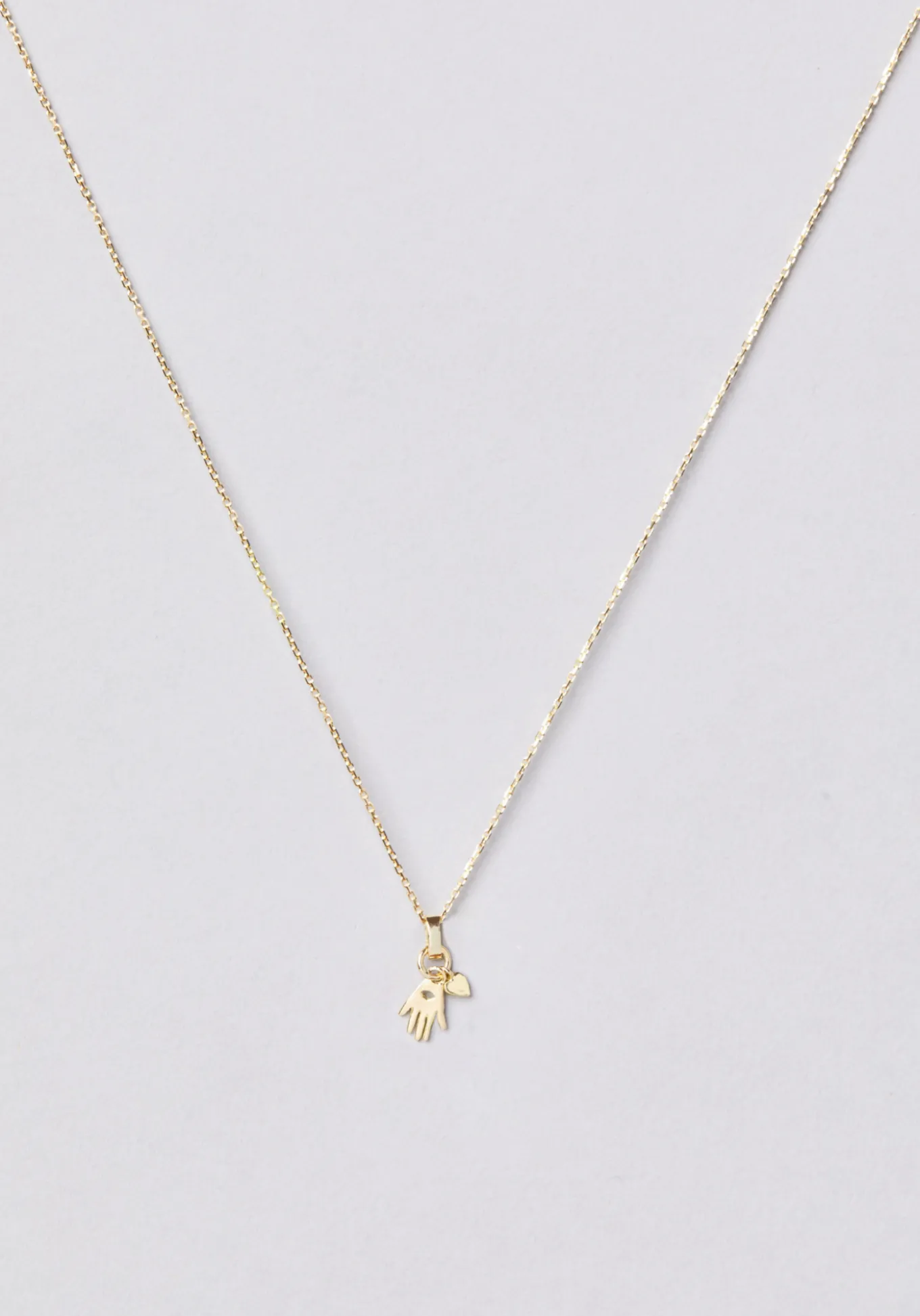 Avec sa chaine fine et délicate, le collier Sofia en or 18 carats est composé de deux pendentifs porte-bonheur : une main protectrice et un coeur délicat. Le collier Sofia de décline en or jaune, or rose ou or blanc.